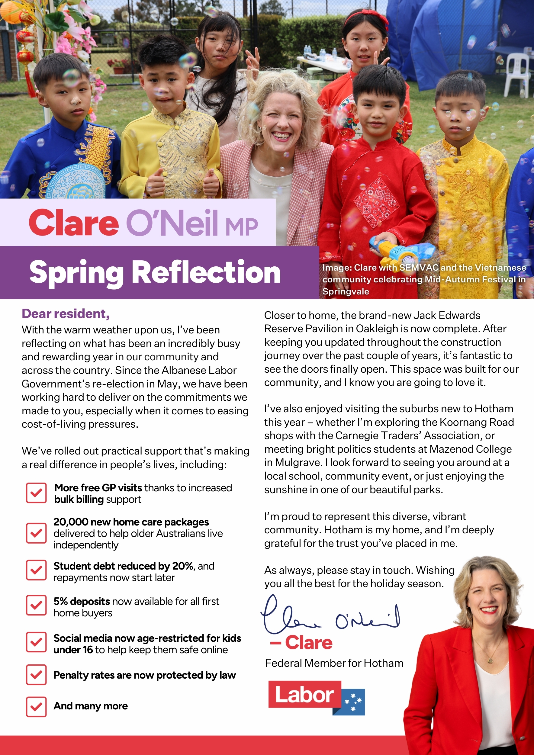 Each quarter, I send out an electorate-wide newsletter to the whole of Hotham to keep you updated on what's been happening in our community.